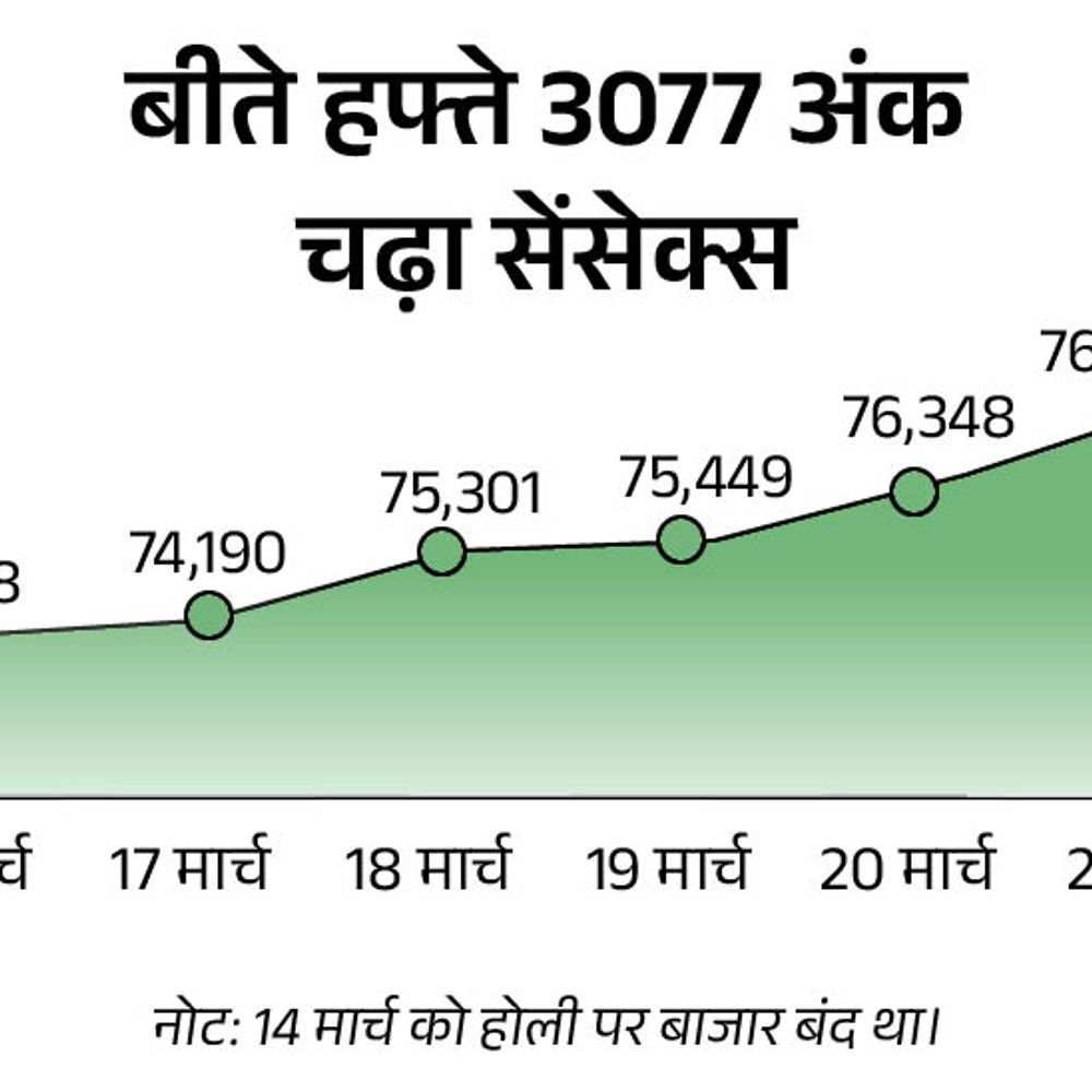 हफ्ते के पहले कारोबार दिन आज यानी सोमवार 24 मार्च को भारतीय शेयर बाजार चढ़कर ओपन हो सकते हैं। ग्लोबल मार्केट में मिलाजुला कारोबार है लेकिन विदेशी निवेशकों ने पिछले कारोबारी दिन में खरीदारी की है। साथ ही भारतीय शेयर बाजार अभी अच्छे वैल्यूएशन पर है। केडिया एडवाइजरी के डायरेक्टर अजय केडिया के अनुसार बाजार को गिराने वाले जो भी इवेंट थे उसे हम डाइजेस्ट कर चुके हैं। जैसे इजराइल-हमास जंग, ट्रेड वॉर, रूस-यूक्रेन जंग। इसके अलावा पहले भारतीय बाजार ओवर वैल्यूड था जो गिरावट के बाद अपनी सही वैल्यू पर आ गया है। कई बड़े शेयर डिस्काउंट में मिल रहे हैं जिसमें लोग खरीदी कर रहे हैं। इन कारणों से अब बाजार में तेजी है और आगे भी इसके जारी रहने कर उम्मीद है। ग्लोबल मार्केट में मिलाजुला कारोबार पिछले हफ्ते बाजार में रही थी 3077 अंक की तेजी बीते हफ्ते के आखिरी कारोबारी दिन शुक्रवार (21 मार्च) को सेंसेक्स 557 अंक चढ़कर 76,905 के स्तर पर बंद हुआ। निफ्टी में भी 159 अंक की तेजी रही, ये 23,350 के स्तर पर बंद हुआ। वही, हफ्तेभर में सेंसेक्स 3077 अंक चढ़ा। शुक्रवार को सेंसेक्स के 30 शेयरों में से 25 में तेजी रही। सबसे ज्यादा NTPC 3.09%, बजाज फाइनेंस 2.62% और कोटक महिंद्रा बैंक 2.14% चढ़े। महिंद्रा, टाटा स्टील, इंफोसिस, टाइटन और बजाज फिनसर्व में 1% से ज्यादा की गिरावट रही। निफ्टी के 50 शेयरों में से 38 में तेजी रही। NSE के सेक्टोरल इंडाइसेज में मीडिया के शेयर में 2.20%, ऑयल एंड गैस में 1.84% और सरकारी बैंक में 1.06% की तेजी रही। निफ्टी मेटल में करीब 1% की गिरावट रही।