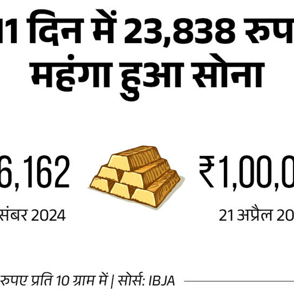 10 ग्राम 24 कैरेट सोने का दाम आज यानी, मंगलवार 22 अप्रैल को पहली बार ₹1 लाख रुपए पर पहुंच गया है। एक दिन पहले सोमवार को सोने की कीमत ₹96,670 थी। इधर, चांदी की कीमत ₹342 गिरकर ₹95,900 प्रति किलो हो गई है। सोमवार को चांदी का भाव ₹96,242 प्रति किलो था। चांदी ने 28 मार्च को ₹1,00,934 का ऑल टाइम हाई बनाया था। सोने में तेजी के 3 कारण 4 महानगरों और भोपाल में सोने की कीमत 111 दिन में 23,838 रुपए महंगा हो चुका है सोना