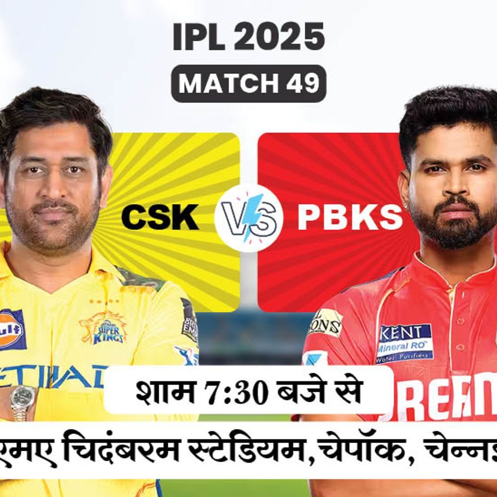 इंडियन प्रीमियर लीग (IPL) 2025 के 49वें मैच में चेन्नई सुपर किंग्स (CSK) का सामना पंजाब किंग्स (PBKS) से होगा। मैच चेपॉक के एमए चिदंबरम स्टेडियम में शाम 7:30 बजे से शुरू होगा। दोनों टीमें इस सीजन में दूसरी बार आमने-सामने होंगी। चेपॉक स्टेडियम में पंजाब ने अपने पिछले तीनों मैच जीते हैं। टीम ने 2023 में CSK को 4 विकेट और 2024 में 7 विकेट से मात दी थी। इससे पहले 2021 में PBKS ने मुंबई को 9 विकेट से हराया था। इस स्टेडियम में चेन्नई और पंजाब ने आपस में कुल 8 मैच खेले हैं। इसमें चेन्नई ने 4 और पंजाब ने 3 मुकाबले जीते हैं। जबकि एक मैच टाई रहा है। मौजूदा सीजन की बात करे तो चेन्नई का प्लेऑफ में जाना मुश्किल है। टीम को 9 मैच में सिर्फ 2 जीत मिली है और CSK पॉइंट्स टेबल के आखिरी पायदान पर है। वहीं PBKS ने अपने 9 में से 5 मैच जीते हैं, जबकि एक मैच बारिश की वजह से रद्द हो गया था। श्रेयस अय्यर की कप्तानी वाली टीम 5वें स्थान पर है। मैच डिटेल्स, 49वां मैच