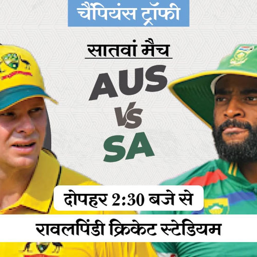 चैंपियंस ट्रॉफी 2025 का 7वां मैच ऑस्ट्रेलिया और साउथ अफ्रीका के बीच रावलपिंडी स्टेडियम में खेला जाएगा। फिलहाल, बारिश के कारण टॉस डिले हुआ है। दोनों टीमें चैंपियंस ट्रॉफी के इतिहास में पहली बार भिड़ेंगी। बारिश मैच में खलल डाल सकती है। आज यहां बारिश के 67% चांसेज हैं। दोनों टीमें इस चैंपियंस ट्रॉफी में अपना-अपना पहला मैच जीतकर आ रही हैं। ऑस्ट्रेलिया ने इंग्लैंड तो साउथ अफ्रीका ने अफगानिस्तान को हराया था। मैच डिटेल्स, सातवां मैच