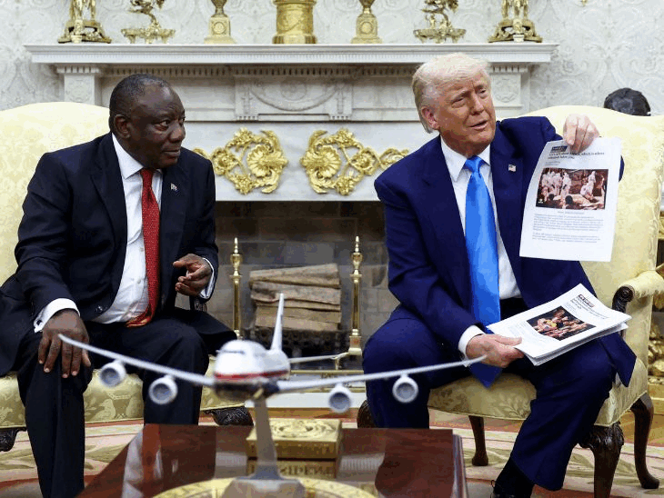 अमेरिकी राष्ट्रपति डोनाल्ड ट्रम्प और साउथ अफ्रीका के राष्ट्रपति सिरिल रामफोसा के बीच बुधवार को व्हाइट हाउस में मीडिया के सामने तीखी बहस हुई। ट्रम्प ने आरोप लगाया कि साउथ अफ्रीका में गोरे किसानों का नरसंहार किया जा रहा है। ओवल ऑफिस में मीटिंग के दौरान ट्रम्प ने एक वीडियो को सबूत के तौर पर दिखाते हुए दावा किया कि साउथ अफ्रीका में गोरे लोगों को बड़े पैमाने पर टारगेट किया जा रहा है। इसके कारण किसान अमेरिका की ओर भाग रहे हैं। रामफोसा को इसके खिलाफ कदम उठाने चाहिए हालांकि, रामफोसा ने दावों का खंडन करते हुए कहा कि नरसंहार के आरोप झूठे हैं। उन्होंने अमेरिकी राष्ट्रपति से कहा- साउथ अफ्रीका में सभी जातियों के लोग हिंसक अपराध से पीड़ित हैं। इनमें अधिकांश अश्वेत हैं। वहां सिर्फ गोरे लोगों को नहीं सताया जा रहा है। रामफोसा ने ट्रम्प को कतर सरकार से गिफ्ट में मिले प्लेन पर तंज भी कसा। उन्होंने कहा- हमारी सरकार साउथ अफ्रीका में रंगभेद दूर करने की कोशिश कर रही है। हालांकि, मुझे दुख है कि मेरे पास आपको देने के लिए विमान नहीं है, जिस पर ट्रम्प ने कहा- काश आपके पास होता। ट्रम्प-रामफोसा में बहस कैसे शुरू हुई, सिलसिलेवार पढ़िए- 1. दोस्ताना माहौल में मीटिंग शुरू हुई- दोनों राष्ट्रपतियों के बीच दोस्ताना माहौल में मीटिंग शुरू हुई। दोनों ने गोल्फ के बारे में बात की। ट्रम्प ने अफ्रीका में लोगों के गोल्फ खेलने के टैलेंट की तारीफ की। साउथ अफ्रीकी राष्ट्रपति रामफोसा ने फिर ‘टी’ शब्द का जिक्र करते हुए दोनों देशों के बीच ट्रेड पर चर्चा करने की कोशिश की। उन्होंने एक मिनरल डील का भी जिक्र किया। 2. ट्रम्प ने अचानक कहा- लाइट बंद करो, वीडियो चलाओ- दोनों नेता के बीच ठीक से बातचीत चल चल रही थी। अचानक ट्रम्प ने अपने स्टाफ से वीडियो चलाने के लिए लाइट्स बंद करने को कहा। इससे रामफोसा चौंक गए। 3. रामफोसा सिर्फ दो-तीन बार वीडियो देखने के लिए मुड़े- जब वीडियो शुरू हुआ, तो रामफोसा ने ट्रम्प से इशारों में सवाल किया कि यह क्या है? हालांकि, ट्रम्प ने उन्हें इंतजार करने का इशारा किया। रामफोसा ने दो-तीन बार पीछे मुड़कर वीडियो देखा। ट्रम्प ने वीडियो को गोरे लोगों के नरसंहार का सबूत बताते हुए कहा कि इसमें हजारों गोरे किसानों की कब्र दिखाई गई हैं। 4. रामफोसा बोले- पता लगाएंगे वीडियो कहां का है- रामफोसा ने अपना संयम बनाए रखते हुए दावों से इनकार किया। उन्होंने कहा- मैंने पहले कभी यह वीडियो नहीं देखा है। हम पता लगाएंगे कि यह वीडियो कहां है। इसकी प्रामाणिकता की गहराई से जांच करेंगे। रामफोसा ने कहा, “हमारे देश में अपराध है, और इससे सभी प्रभावित हैं- चाहे वो काला हो या गोरा” 5. ट्रम्प नहीं रुके, न्यूज आर्टिकल्स दिखाकर हत्या-हत्या कहने लगे- रा