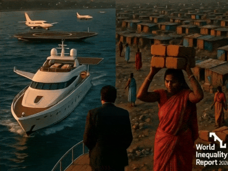 भारत में आय और संपत्ति की असमानता रिकॉर्ड स्तर पर पहुंच गई है। वर्ल्ड इनइक्वालिटी रिपोर्ट 2026 के मुताबिक, भारत की नेशनल इनकम का 58% हिस्सा टॉप 10% अमीर लोगों के पास चला जाता है, जबकि नीचे की 50% आबादी को महज 15% ही मिलता है। संपत्ति के मामले में भी यही हाल है। टॉप 10% के पास 65% संपत्ति है और टॉप 1% के पास करीब 40%। रिपोर्ट बुधवार को रिलीज हुई। रिपोर्ट में कहा गया है कि भारत में प्रति व्यक्ति औसत सालाना आय (PPP) 6.56 लाख रुपए है। इसमें टॉप 10% को 58% इनकम का शेयर मिलता है। 2021 में ये 57% थी। देश के टॉप 10% लोग ₹10.58 करोड़ के मालिक दूसरी तरफ, बॉटम 50% को सिर्फ 15% हिस्सा, जो पहले 13% था। संपत्ति में असमानता और भी ज्यादा है। यहां टॉप 10% के पास कुल संपत्ति का 65% है। वहीं, प्रति व्यक्ति औसत संपत्ति 29.62 लाख रुपए है। 50% आबादी के पास प्रति व्यक्ति सिर्फ 6.88 लाख रुपए की औसत संपत्ति है। वहीं टॉप के 10% लोग 10.58 करोड़ रुपए संपत्ति के मालिक है। टॉप 0.001% (करीब 56,000 लोग) के पास तो प्रति व्यक्ति 10 करोड़ यूरो (करीब 1058 करोड़ रुपए) से ज्यादा की वेल्थ है। इस रिपोर्ट को 200 से ज्यादा लोग तैयार करते हैं। रिपोर्ट के एडिटर्स- ल्यूकस चांसल, रिकार्डो गोमेज कैररा, रोवाइदा मोशरिफ और थॉमस पिकेटी ने इस रिपोर्ट के लिए डेटा 180 देशों से कलेक्ट किया। फीमेल लेबर पार्टिसिपेशन रेट सिर्फ 15.7% भारत में फीमेल लेबर पार्टिसिपेशन रेट सिर्फ 15.7% है। यानी 100 पुरुष की तुलना में केवल 15.7 महिलाओं के पास ही रोजगार है। ये हाल पिछले दशक में जस का तस है। ग्लोबल लेवल पर महिलाएं टोटल लेबर इनकम का महज 25% हिस्सा ले पाती हैं। भारत टॉप इनइक्वालिटी वाले देशों में पूरी दुनिया की बात करें तो टॉप 10% लोगों के पास 75% संपत्ति है, जबकि 50% निचले तबके के पास सिर्फ 2% संपत्ति ही है। इनकम में 53% हिस्सेदारी 10% लोग ले जाते हैं। वहीं, बॉटम 50% को 8% ही मिल पाता है। लेकिन भारत इसमें सबसे ऊपर है- दक्षिण अफ्रीका के बाद, जहां टॉप 10% को 66% इनकम और 85% वेल्थ मिलती है। लैटिन अमेरिका के देश जैसे ब्राजील, मैक्सिको में भी टॉप 10% को 60% इनकम। यूरोप में स्वीडन, नॉर्वे जैसे देश बेहतर हैं, जहां बॉटम 50% को 25% इनकम मिलती है। 1980 में भारत की आबादी ग्लोबल मिडिल 40% में ज्यादा थी, लेकिन 2025 तक लगभग पूरी बॉटम 50% में खिसक गई। चीन ऊपर चढ़ा है। रिपोर्ट कहती है कि नॉर्थ अमेरिका और ओशिनिया में वेल्थ ग्लोबल एवरेज से 338% ज्यादा है, जबकि साउथ एशिया जैसे भारत में काफी नीचे। कार्बन एमिशन में भी गैप- टॉप 10% 77% एमिशन के जिम्मेदार, बॉटम 50% सिर्फ 3%। —————————- भारत के 1687 लोगों की नेटवर्थ ₹167 लाख करोड़: ये देश की GDP का आधा; ₹9.55 लाख करोड़ के साथ अंबानी परिवार सबसे अमीर हुरुन इंडिया की भारत के सबसे अमीर हस्तियों की लिस्ट में मुकेश अंबानी फैमिली टॉप पर है। उनकी नेटवर्थ 9.55 लाख करोड़ रुपए है। गौतम अडाणी और उनका परिवार 8.15 ल