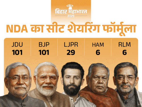 बिहार विधानसभा चुनाव को लेकर NDA ने रविवार को सीट शेयरिंग की घोषणा कर दी है। बीजेपी 101 सीटों पर चुनाव लड़ेगी, वहीं जदयू 101 सीटों पर लड़ने जा रही है। जबकि चिराग पासवान की पार्टी LJP (R) 29 सीटों पर अपने प्रत्याशी उतारेगी। जीतन राम मांझी की हिंदुस्तान अवाम मोर्चा (HAM) को 6 और उपेंद्र कुशवाहा की पार्टी RLM को 6 सीटें दी गई हैं। सीट शेयरिंग के बाद NDA ने कल यानी सोमवार को पटना में प्रेस कॉन्फ्रेंस बुलाई है। सीट शेयरिंग में चिराग की जिद के आगे से पहले 40 सीटों की डिमांड करने वाले जीतन राम मांझी ने 6 सीटें मिलने पर कहा- मैं संतुष्ट हूं। हालांकि इसके बाद मांझी ने तीखे तेवर दिखाए हैं। उन्होंने कहा, ‘आलाकमान ने जो फैसला लिया है वो स्वीकार है। हमें सिर्फ 6 सीट देकर उन्होंने हमारी अहमियत कम आंकी है। इसका असर NDA पर पड़ सकता है।’ मांझी की पार्टी ने 4 सीटों पर कैंडिडेट्स का भी ऐलान कर दिया है। सूत्रों के मुताबिक, इमामगंज से दीपा मांझी, बराचट्टी से ज्योति देवी, टेकारी से अनिल कुमार और सिकंदरा से प्रफुल्ल कुमार मांझी को टिकट दिया गया है। बीजेपी-जदयू अब बराबर के भाई 2005 से लेकर पिछले विधानसभा चुनाव तक JDU ने हमेशा बीजेपी से अधिक सीटों पर चुनाव लड़ा है। JDU पिछले 4 चुनाव में हमेशा बड़े भाई की भूमिका में रहता था। 2020 में ही जदयू 115 और बीजेपी 110 सीटों पर चुनाव लड़ी थी, लेकिन 2025 विधानसभा चुनाव में दोनों पार्टियां 101-101 सीटों पर लड़ेंगी। अब दोनों बराबर वाले भाई हो गए हैं। भास्कर की खबर पर लगी मुहर भास्कर ने डेढ़ महीने पहले यानी 28 अगस्त को ही बता दिया था कि बीजेपी 101, और जदयू 102 सीटों पर चुनाव लड़ेगी। इसके साथ 40 सीटों का बंटवारा चिराग, उपेंद्र कुशवाहा और मांझी के बीच होगा। पिछले 2 विधानसभा चुनाव में NDA की सीट शेयरिंग और रिजल्ट 2020 के विधानसभा चुनाव में भाजपा 110 सीटों पर लड़ी थी, उसे 74 पर जीत मिली थी। वहीं JDU 115 सीटों पर लड़ी थी और 43 सीटों पर जीती थी। NDA की सीट शेयरिंग से जुड़े अपडेट्स के लिए नीचे ब्लॉग से गुजर जाइए…