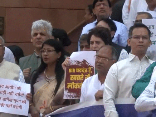 संसद के मानसून सत्र का गुरुवार को चौथा दिन है। विपक्ष के सांसदों ने बिहार वोटर वेरिफिकेशन मामले पर संसद के बाहर मकर द्वार पर लगातार तीसरे दिन प्रदर्शन किया। सोनिया गांधी भी इसमें शामिल हुईं।वहीं प्रियंका गांधी ने खतरे में लोकतंत्र लिखा पोस्टर लहराया। लोकसभा-राज्यसभा में आज भी विपक्ष के हंगामे के आसार है। विपक्षी सांसदों की मांग है कि संसद में पहलगाम हमला, ऑपरेशन सिंदूर और बिहार वोटर्स मामले पर चर्चा हो। PM मोदी इनपर जवाब दें। पिछले 3 दिनों से विपक्ष के हंगामे के चलते दोनों सदनों में लगातार एक-आधे घंटे भी कार्यवाही नहीं चल सकी। बुधवार को बिहार वोटर वेरिफिकेशन मुद्दे पर विपक्ष ने नारेबाजी की। इस वजह से सदन की कार्यवाही 3 बार रोकी गई, फिर 2 बजे दोनों सदनों को अगले दिन 11 बजे तक स्थगित कर दिया गया। इस बीच, बुधवार को जानकारी सामने आई कि ऑपरेशन सिंदूर को लेकर लोकसभा में 28 जुलाई और राज्यसभा में 29 जुलाई को चर्चा होगी। मीडिया रिपोर्ट्स के मुताबिक, दोनों सदनों में बहस के लिए 16-16 घंटे का समय निर्धारित किया गया है। बिहार SIR विवाद को ग्राफिक्स में समझिए…
