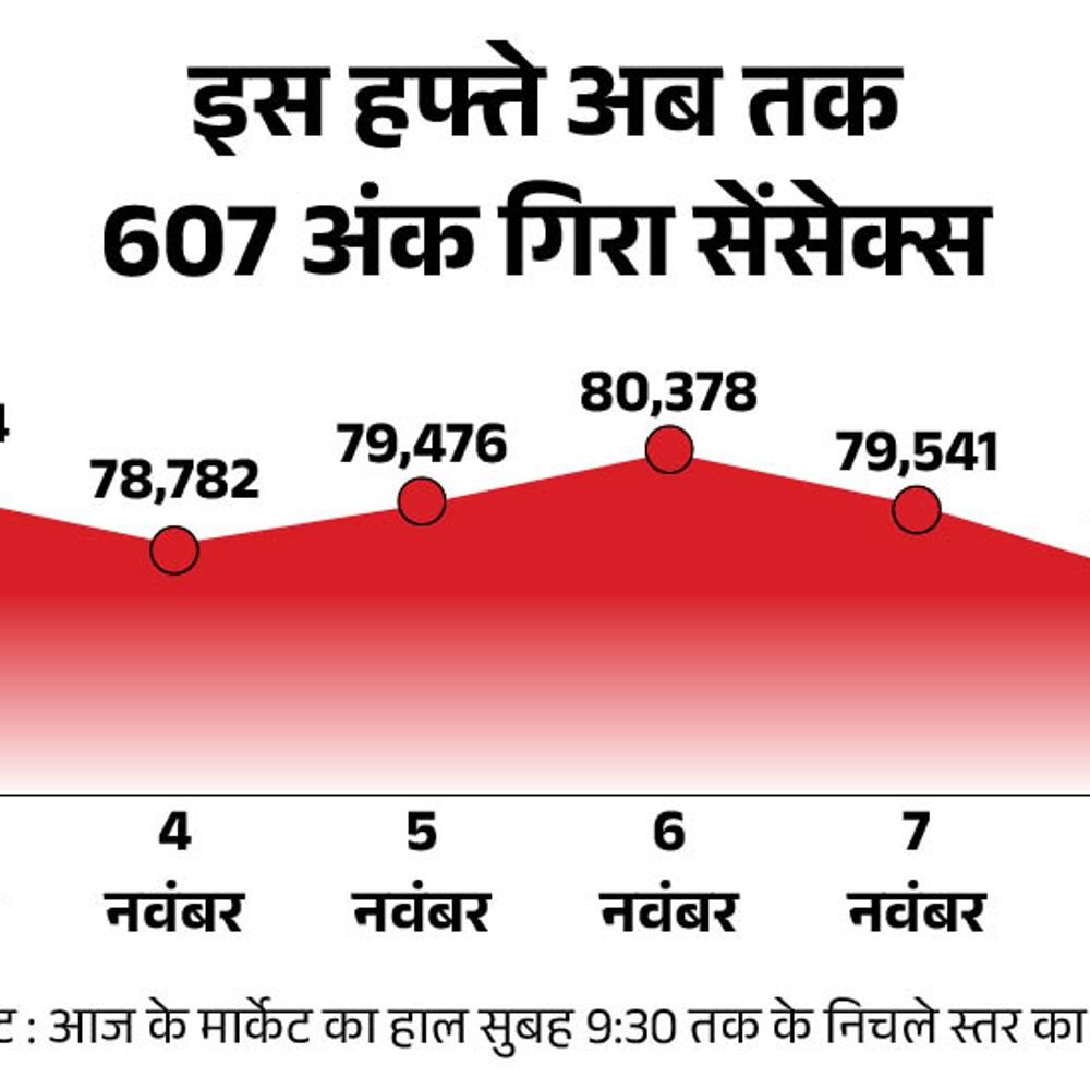 सेंसेक्स आज यानी 8 नवंबर को 100 अंक से ज्यादा की गिरावट के साथ 79,400 के स्तर पर कारोबार कर रहा है। निफ्टी में भी 50 अंक की गिरावट है, ये 24,140 के स्तर पर कारोबार कर रहा है। सेंसेक्स के 30 शेयरों में से 23 में गिरावट और 7 में तेजी है। निफ्टी के 50 शेयरों में से 36 में गिरावट और 14 में तेजी है। IT सेक्टर को छोड़कर NSE के सभी सेक्टोरल इंडेक्स गिरावट के साथ कारोबार कर रहे हैं। विदेशी निवेशकों ने ₹4,888.77 करोड़ के शेयर बेचे स्विगी और ACME सोलर होल्डिंग्स के IPO के लिए बोली लगाने का आज आखिरी दिन स्विगी लिमिटेड और ACME सोलर होल्डिंग्स लिमिटेड के IPO के लिए बोली लगाने का आज आखिरी दिन है। दो दिन में स्विगी का IPO टोटल 0.35 गुना सब्सक्राइब हुआ। रिटेल कैटेगरी में यह इश्यू 0.84 गुना, क्वालिफाइड इंस्टीट्यूशनल बायर्स (QIB) कैटगरी में 0.28 गुना और नॉन-इंस्टीट्यूशनल इन्वेस्टर्स (NII) कैटगरी में 0.14 गुना सब्सक्राइब हुआ। वहीं, ACME सोलर होल्डिंग्स का IPO दो दिन में टोटल 0.74 गुना सब्सक्राइब हुआ। रिटेल कैटेगरी में यह इश्यू 2.16 गुना, क्वालिफाइड इंस्टीट्यूशनल बायर्स (QIB) 0.33 गुना और नॉन-इंस्टीट्यूशनल इन्वेस्टर्स (NII) कैटगरी में 0.59 गुना सब्सक्राइब हुआ। 13 नवंबर को दोनों कंपनियों के शेयर बॉम्बे स्टॉक एक्सचेंज (BSE) और नेशनल स्टॉक एक्सचेंज (NSE) पर लिस्ट होंगे। पढ़ें पूरी खबर… कल गिरावट के साथ बंद हुआ था बाजार इससे पहले कल यानी 7 नवंबर को सेंसेक्स 836 अंक की गिरावट के साथ 79,541 के स्तर पर बंद हुआ था। निफ्टी में भी 284 अंक की गिरावट रही, ये 24,199 के स्तर पर बंद हुआ था। सेंसेक्स के 30 शेयरों में से 29 में गिरावट और 1 में तेजी थी। निफ्टी के 50 शेयरों में से 46 में गिरावट और 4 में तेजी थी। NSE के सभी सेक्टोरल इंडेक्स गिरावट के साथ बंद हुए थे। मेटल सेक्टर में सबसे ज्यादा 2.73% की गिरावट थी।