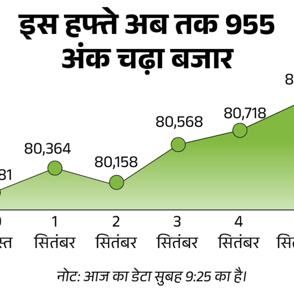 हफ्ते के आखिरी कारोबारी दिन आज शुक्रवार, 5 सितंबर को सेंसेक्स 300 अंक चढ़कर 81,000 के स्तर पर कारोबार कर रहा है। निफ्टी में भी करीब 100 अंक की तेजी है, ये 24,800 के ऊपर है। सेंसेक्स के 30 शेयरों में से 24 में तेजी, 6 में गिरावट है। महिंद्रा, एशियन पेंट्स और पावर ग्रिड के शेयर्स 1% ऊपर हैं। ITC, HUL और सनफार्मा में गिरावट है। निफ्टी के 50 में से 43 शेयरों में तेजी और 7 में गिरावट है। NSE के IT, मेटल, ऑटो, रियल्टी और ऑयल एंड गैस इंडेक्स में तेजी है। अकेले FMCG नीचे है। ग्लोबल मार्केट में तेजी 4 सितंबर को घरेलू निवेशकों ने ₹2,233 करोड़ के शेयर्स खरीदे कल बाजार में 150 अंक की तेजी रही थी GST में बदलाव के ऐलान के बाद गुरुवार, 4 सिंतबर को शेयर बाजार में तेजी रही। सेंसेक्स 150 पॉइंट चढ़कर 80,718 के स्तर पर बंद हुआ। निफ्टी में भी 19 अंक की तेजी रही, ये 24,734 के स्तर पर बंद हुआ। आज के बाजार में ऑटो, FMCG और फाइनेंशियल सर्विसेज के शेयर्स में तेजी रही। सरकार ने इनपर GST कम करने का ऐलान किया है। IT, मीडिया, मेटल फार्मा और PSU बैंकिंग 1% तक गिरकर बंद हुए।