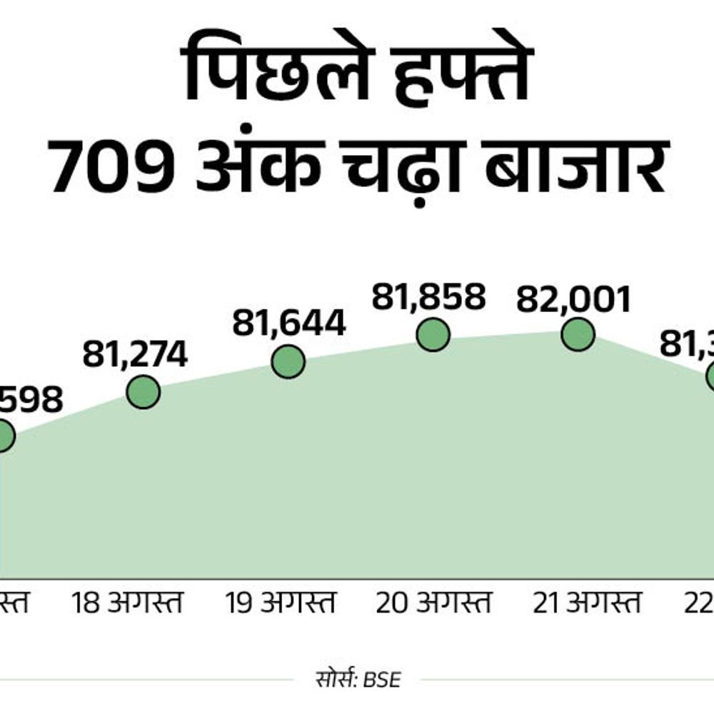 हफ्ते के पहले कारोबारी दिन आज यानी सोमवार, 25 अगस्त को सेंसेक्स 300 अंक चढ़कर 81,600 के स्तर पर कारोबार कर रहा है। निफ्टी में भी 100 अंक की तेजी है, ये 24,960 के स्तर पर है। सेंसेक्स के 30 शेयरों में से 24 में तेजी और 6 में गिरावट है। इंफोसिस, टेक महिंद्रा और TCS में तेजी है। ICICI, HDFC और बजाज फिनसर्व के शेयरों में गिरावट है। निफ्टी के 50 शेयरों में से 39 में तेजी और 11 में गिरावट है। NSE के मीडिया इंडेक्स को छोड़कर सभी में तेजी है। IT करीब 2% ऊपर है। रियल्टी, मेटल और फार्मा में भी तेजी है। ग्लोबल मार्केट में तेजी 22 अगस्त को FIIs ने 1,623 करोड़ रुपए के शेयर्स बेचे शुक्रवार को 694 अंक गिरा था बाजार पिछले हफ्ते के आखिरी कारोबारी दिन शुक्रवार, 22 अगस्त को सेंसेक्स 694 अंक गिरकर 81,307 के स्तर पर बंद हुआ। निफ्टी में भी 214 अंक की गिरावट रही, ये 24,870 पर आ गया। सेंसेक्स के 30 में से 23 शेयरों में गिरावट रही, 7 ऊपर बंद हुए। एशियन पेंट्स, अल्ट्राटेक सीमेंट और टाटा स्टील सहित कुल 12 शेयरों में 1% से 2.5% तक की गिरावट रही। महिंद्रा, मारुति और BEL चढ़कर बंद हुए। निफ्टी के 50 शेयरों में से 42 में गिरावट और केवल 8 में तेजी रही। NSE के मेटल इंडेक्स में 1.25%, PSU बैंकिंग में 1.12%, प्राइवेट बैंक में 1.06% और FMCG में 1.00% की गिरावट रही। मीडिया, फार्मा और हेल्थकेयर में मामूली तेजी रही। —————————- ये खबर भी पढ़ें… 26 और 28 अगस्त को बाजार में रिवर्सल की उम्मीद: जानें सपोर्ट और रेजिस्टेंस के अहम लेवल; 5 फैक्टर्स तय करेंगे बाजार की चाल शेयर बाजार के लिए 25 अगस्त से शुरू होने वाले हफ्ते में दो दिन काफी अहम है। वेल्थव्यू एनालिटिक्स के डायरेक्टर हर्षुभ शाह के मुताबिक 26 और 28 अगस्त को बाजार में रिवर्सल दिख सकता है। वहीं 27 अगस्त को गणेश चतुर्थी के कारण बाजार बंद रहेगा। इसके अलावा 4 कारोबारी दिन वाले इस हफ्ते में ग्लोबल मार्केट के संकेत, अमेरिकी टैरिफ से लेकर विदेशी निवेशकों की खरीद-बिक्री और टेक्निकल फैक्टर्स बाजार की चाल तय करेंगे। पूरी एनालिसिस पढ़ें…