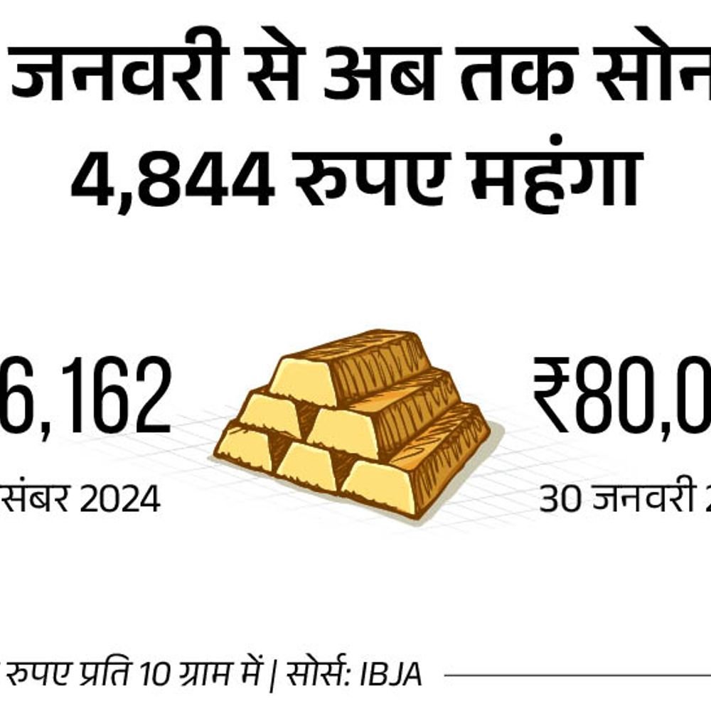 सोना आज यानी 30 जनवरी को अपने ऑल टाइम हाई पर पहुंच गया। इंडिया बुलियन एंड ज्वेलर्स एसोसिएशन (IBJA) के अनुसार 10 ग्राम 24 कैरेट सोने का भाव 81,006 रुपए हो गया है। बुधवार को इसके दाम 80,975 रुपए प्रति दस ग्राम थे। वहीं, चांदी की कीमत में भी आज बढ़त रही। ये 920 रुपए बढ़कर 91,600 रुपए प्रति किलो हो गई है। इससे पहले चांदी की कीमत 90,680 रुपए प्रति किलो थी। चांदी ने 23 अक्टूबर 2024 को अपना ऑल टाइम हाई बनाया था। तब ये 99,151 रुपए प्रति किलो पर पहुंच गई थी। इस साल अब तक ₹4,844 महंगा हुआ सोना