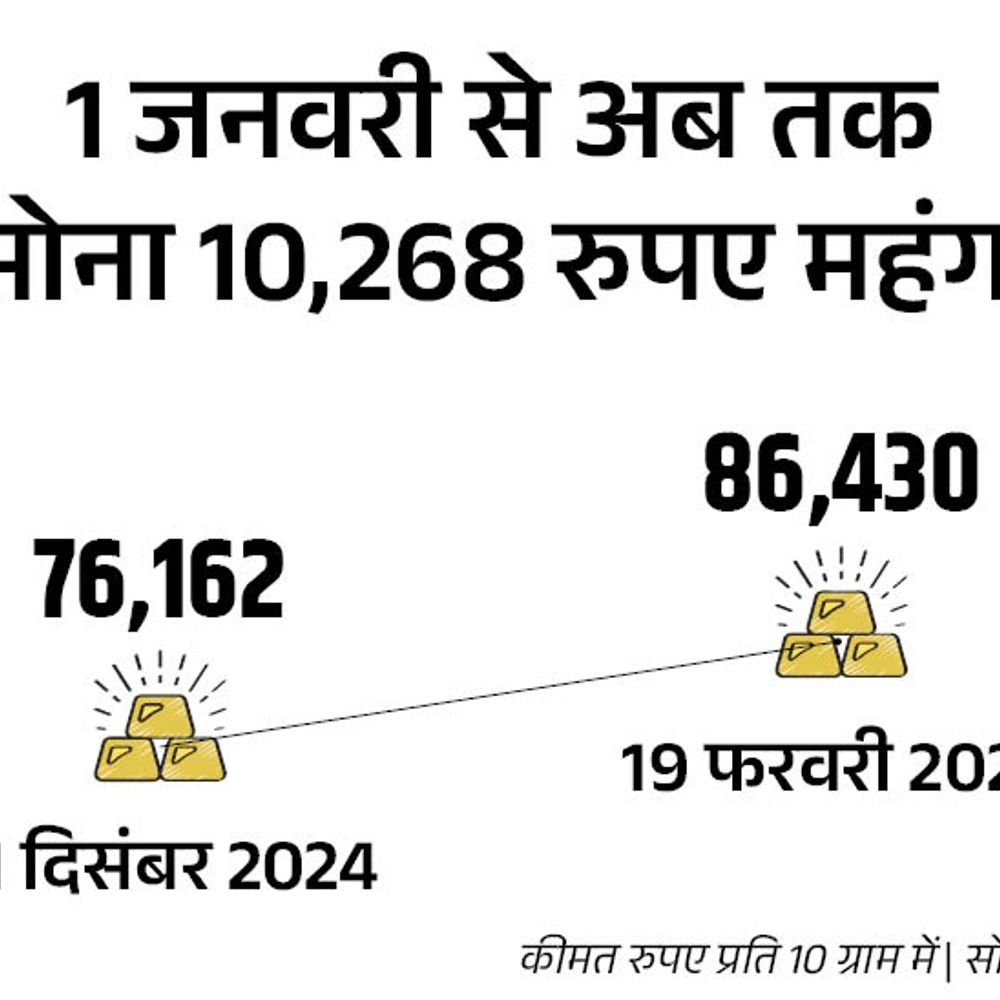 इस साल यानी 1 जनवरी से अब तक 10 ग्राम 24 कैरेट सोने का दाम 76,162 रुपए से 10,268 रुपए बढ़कर 86,430 रुपए पर पहुंच गया है। वहीं, चांदी का भाव भी 86,017 रुपए प्रति किलो से 10,983 रुपए बढ़कर 97,000 रुपए पर पहुंच गया है। सोने में तेजी के 4 कारण इस साल 90 हजार रुपए तक जा सकता है सोना