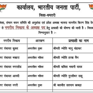 धमतरी में भाजपा के नगर पंचायत प्रत्याशियों की लिस्ट:5 नगर पंचायत में 4 महिला अध्यक्ष सहित 27 महिला वार्ड पार्षद उम्मीदवार घोषित