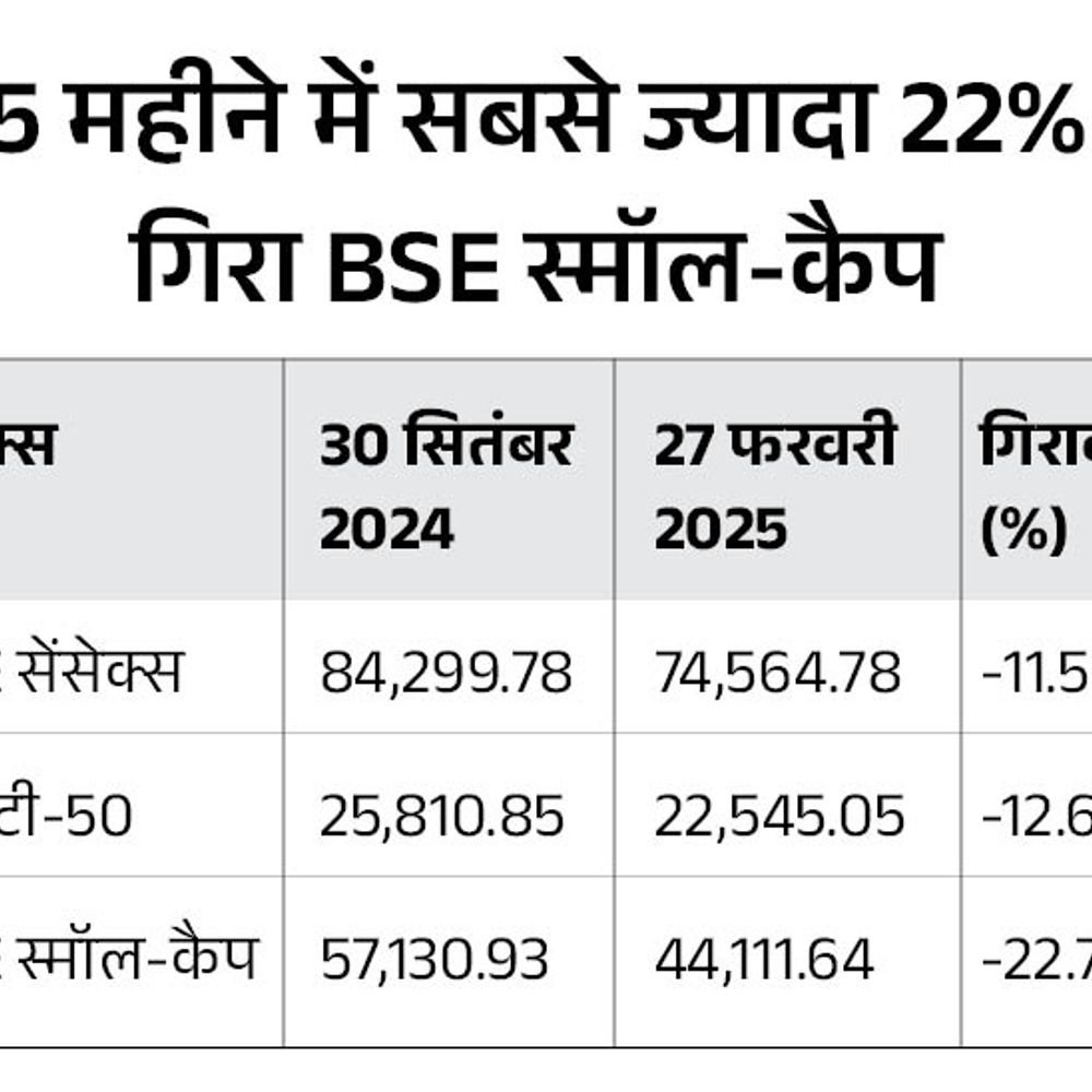 आज यानी 28 फरवरी को सेंसेक्स 1414 अंकों (1.90%) गिरकर 73,198 के स्तर पर बंद हुआ। निफ्टी भी 420 अंक (1.86%) गिरकर 22,124 के स्तर पर बंद हुआ। अक्टूबर 2024 से, निफ्टी हर महीने गिरावट में बंद हुआ है। ये 5 महीने में 12% गिर चुका है। 1996 के बाद यह पहली बार है कि बाजार में लगातार पांच महीने गिरावट आई है। इससे पहले 1996 में जुलाई से लेकर नवंबर महीने के बीच बाजार में लगातार 5 महीने गिरावट दर्ज की गई थी। इन 5 महीनों के दौरान निफ्टी 50 इंडेक्स 26% गिरा था। 1. बीते 5 महीनों में निवेशकों की वेल्थ कितनी घटी है? 30 सितंबर 2024 को बॉम्बे स्टॉक एक्सचेंज यानी बीएसई पर लिस्टेड कंपनियों का मार्केट कैप 474 लाख करोड़ रुपए था जो 28 फरवरी को घटकर 384 लाख करोड़ रुपए रह गया। यानी, 5 महीनों में निवेशकों की वेल्थ 90 लाख करोड़ रुपए घट गई है। 2. शेयर बाजार में लगातार गिरावट के क्या कारण हैं? 3. इस गिरावट में निवेशकों को क्या करना चाहिए? एसेट मैनेजमेंट फर्म फर्स्ट ग्लोबल की एमडी देविना मेहरा कहती हैं- अमेरिका से लेकर यूरोप में की गई एकेडमिक स्टडीज से पता चलता है कि जब भी लोग बाजार में निवेश को लेकर घबराएं या चिंतित रहते हैं तब-तब बाजार ने एवरेज से ज्यादा रिटर्न दिया है। यानी, जब भी आप सोचते हैं कि शेयर बेच देना चाहिए, एसआईपी बंद कर देना चाहिए और बाजार से निकल जाना चाहिए वो समय ही बाजार में निवेश का सबसे अच्छा समय होता है। इसे दो उदाहरण से समझते हैं: यानी, जब-जब बाजार में गिरावट आई है इसमें तेजी से रिकवरी भी दिखी है। ऐसे में जो निवेशक पहले से इन्वेस्टेड है उन्हें अपने निवेश में बना रहना चाहिए। वहीं जो लोग नया निवेश करना चाहते हैं वह थोड़ा-थोड़ा कर निवेश कर सकते हैं। 4. क्या ग्लोबल मार्केट में भी गिरावट आई है? 5. इतिहास में कितने महीने लगातार भारतीय बाजार गिरा है? जुलाई 1990 में निफ्टी 50 इंडेक्स लॉन्च हुआ था। आंकड़ों से पता चलता है कि निफ्टी 50 ने 1995 में अपना सबसे खराब मंथली परफॉर्मेस दर्ज किया था। तब निफ्टी सितंबर 1995 से अप्रैल 1996 तक लगातार आठ महीने गिरा था। इस दौरान 31% से ज्यादा की गिरावट दर्ज की गई थी।